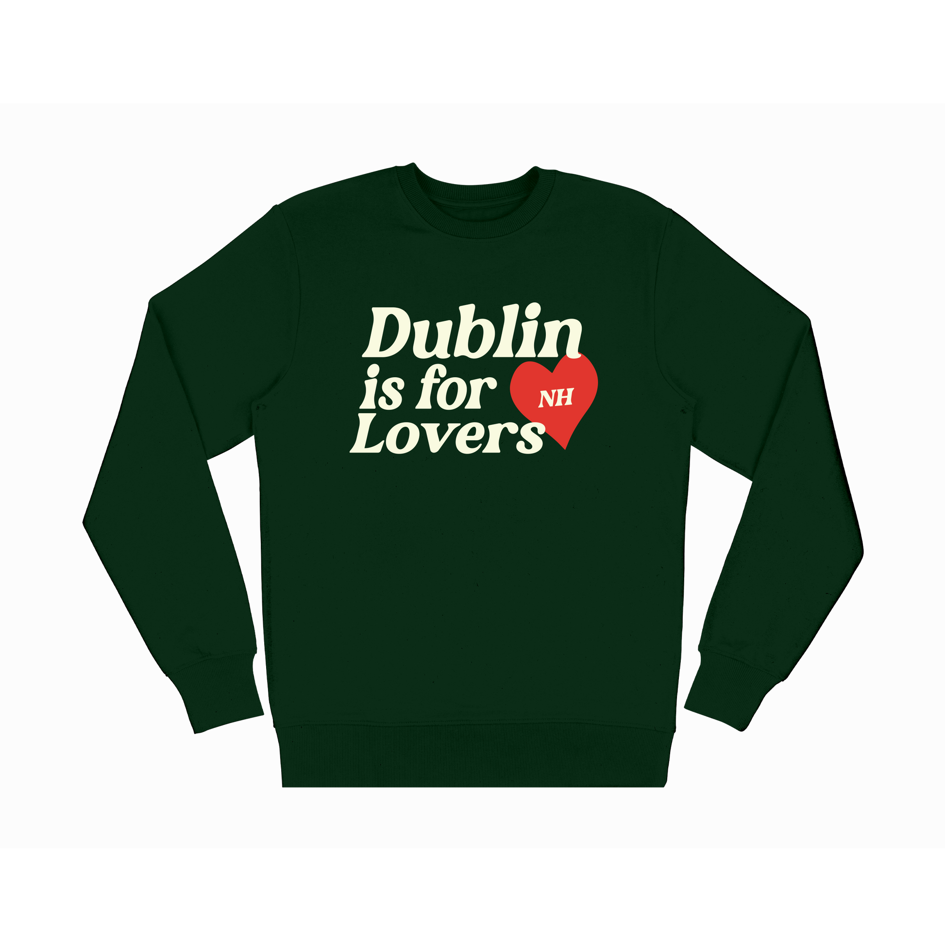 Dublin Is For Lovers Crewneck in forest green ringspun cotton and polyester. Featuring 'Dublin is for Lovers" on the front.