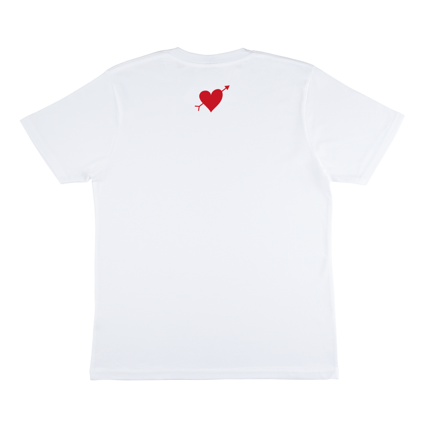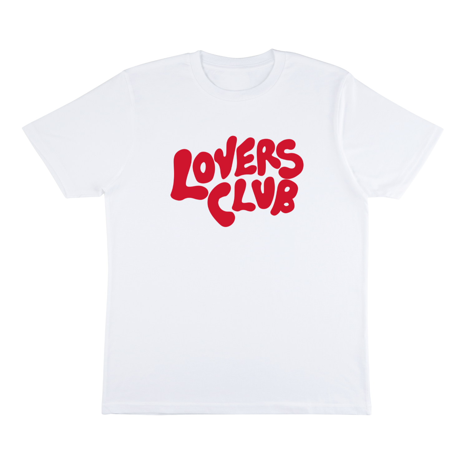 Lovers Club Tee in white combed ringspun cotton. Featuring Lovers Club design on the front and heart on the back neck.
