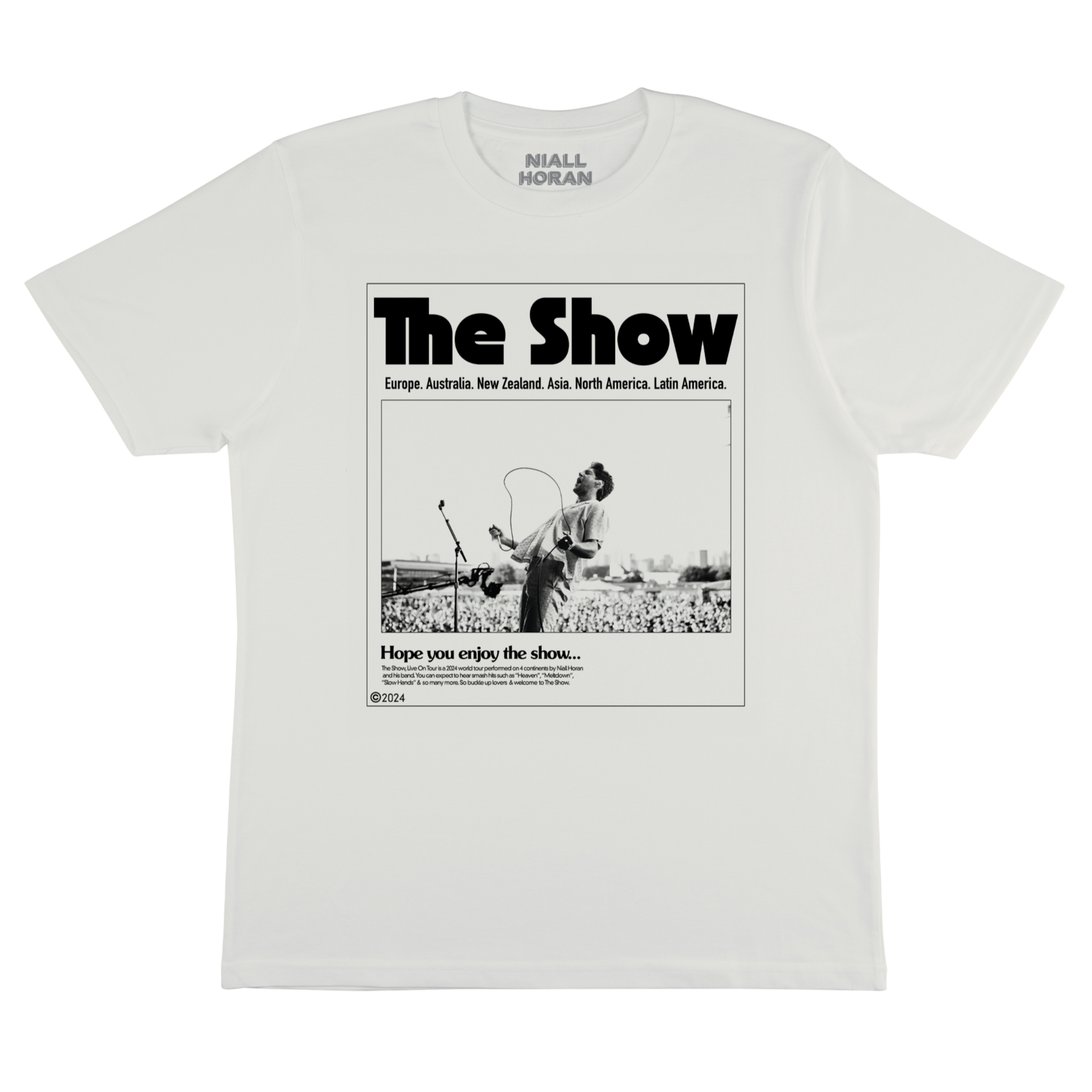 The Show Photo Dates Natural Tee in combed ringspun cotton. Featuring The Show black and white photo on the front and cities of the world tour on the back.